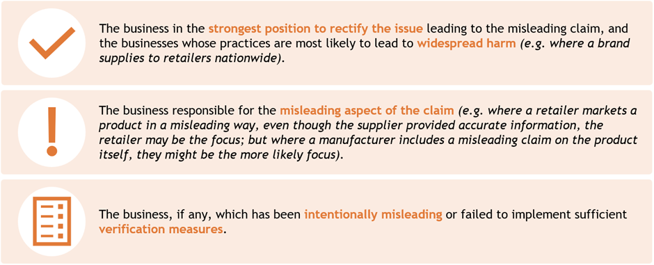 The Supply Chain Guidance recommends that businesses work together to ensure that claims made to consumers are accurate and not misleading. In practice, businesses will need to consider the maturity of their supply chains and their wider regulatory context as part of their compliance efforts.