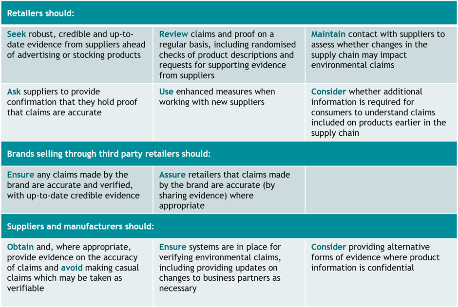 The Supply Chain Guidance includes checklists with suggestions for retailers, brands and suppliers and manufacturers when making environmental claims. In summary, these recommend that: